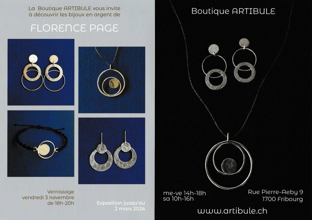 DÈS LE 3 NOVEMBRE, NOUS VOUS CONVIONS À VENIR DÉCOUVRIR NOTRE NOUVELLE EXPOSITION QUI VOUS PRÉSENTERA LES MAGNIFIQUES BIJOUX EN ARGENT DE FLORENCE PAGE. LE VERNISSAGE AURA LIEU LE VENDREDI 3 NOVEMBRE DE 18 À 20H. L’EXPOSITION DURERA JUSQU’AU 2 MARS 2024. AVEC PLAISIR À TRÈS BIENTÔT.