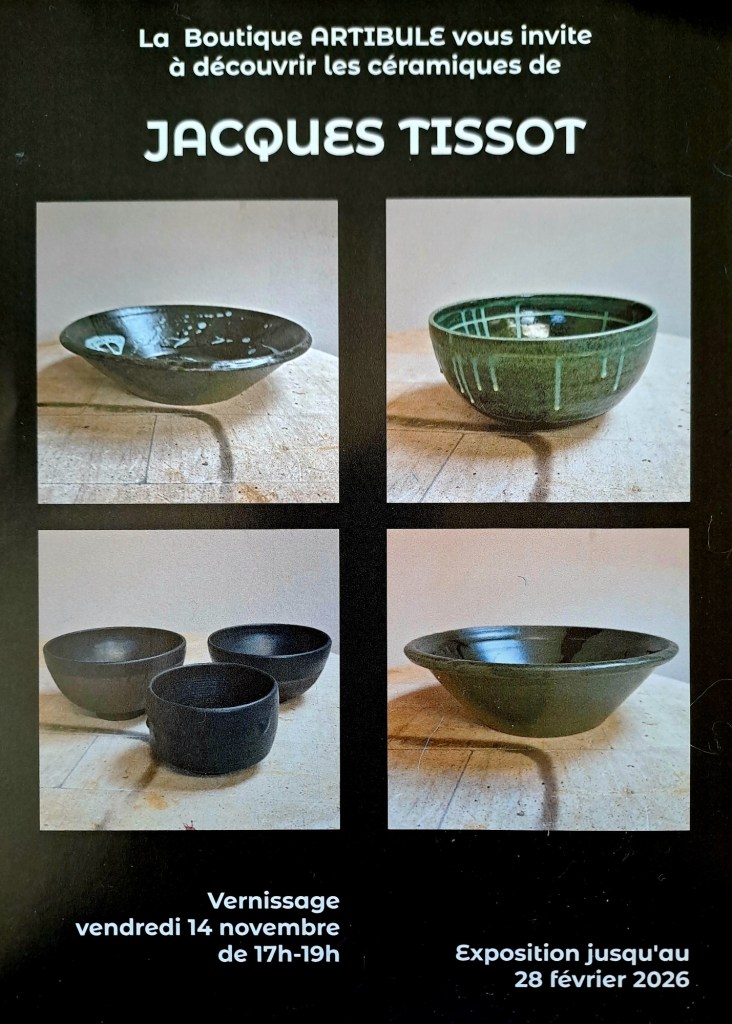La boutique Artibule se réjouit de vous inviter à découvrir les céramiques de Jacques Tissot. Le vernissage aura lieu le vendredi 14 novembre de 17h à 19h. Vous aurez également l’occasion d’admirer le travail de ce céramiste à d’autres moments, l’exposition dure en effet jusqu’au 28 février 2026.