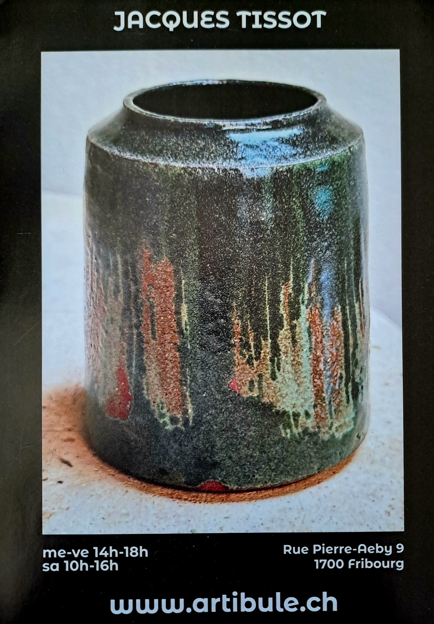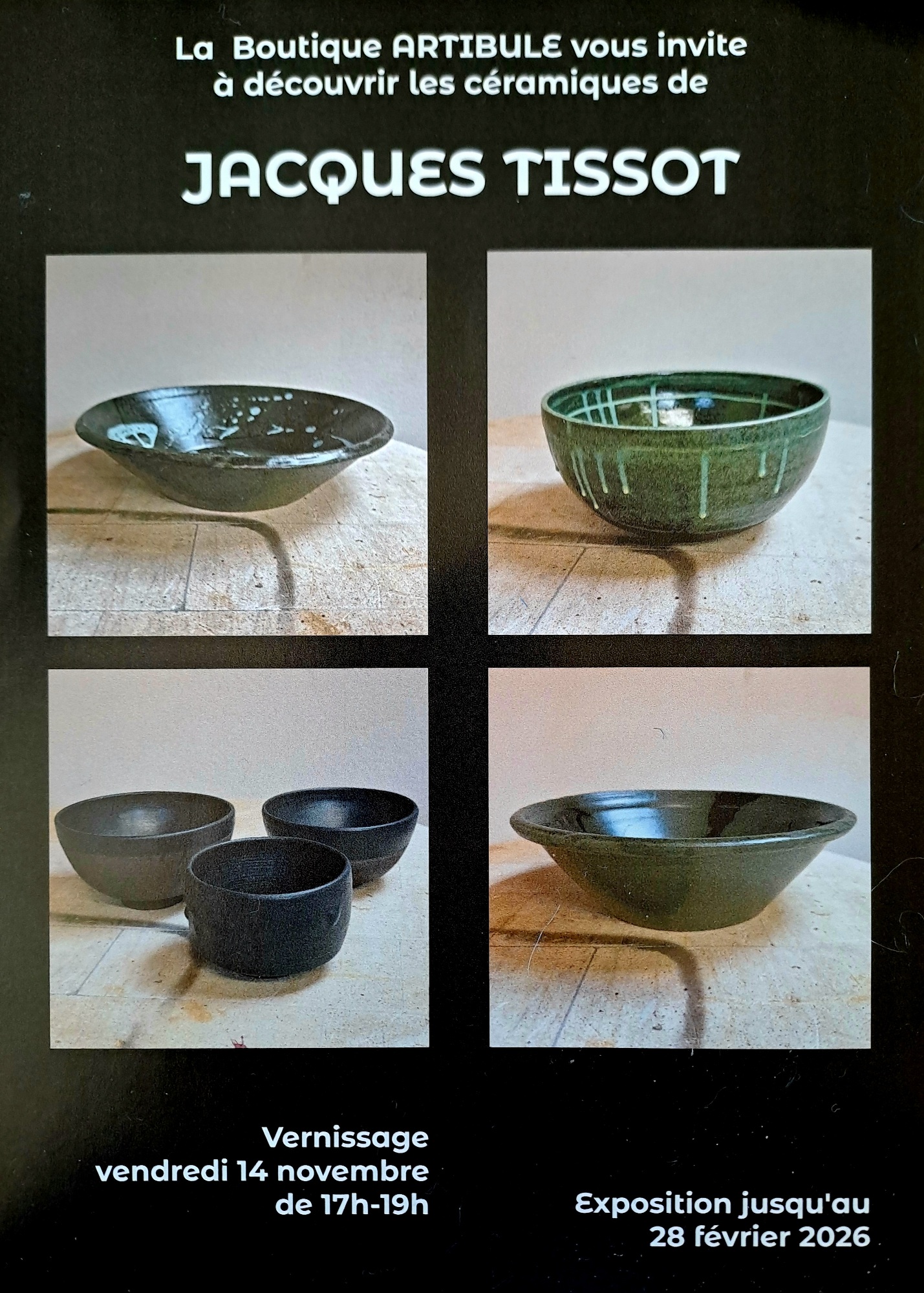 La boutique Artibule se réjouit de vous inviter à découvrir les céramiques de Jacques Tissot. Le vernissage aura lieu le vendredi 14 novembre de 17h à 19h. Vous aurez également l’occasion d’admirer le travail de ce céramiste à d’autres moments, l’exposition dure en effet jusqu’au 28 février 2026.