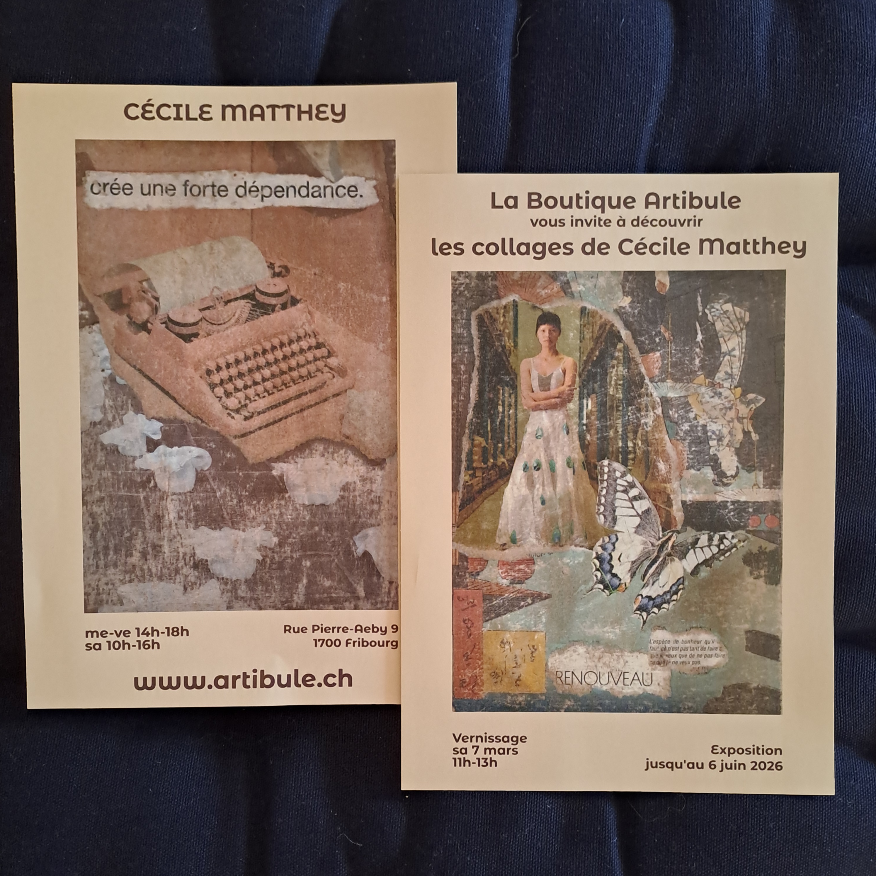 Exposition des magnifiques collages de Cécile Matthey. Vernissage le samedi 7 mars 2026, de 11h à 13h. Venez découvrir son univers poétique et délicat. L’exposition se prolonge jusqu’au 6 juin 2026. Au plaisir de vous y voir.